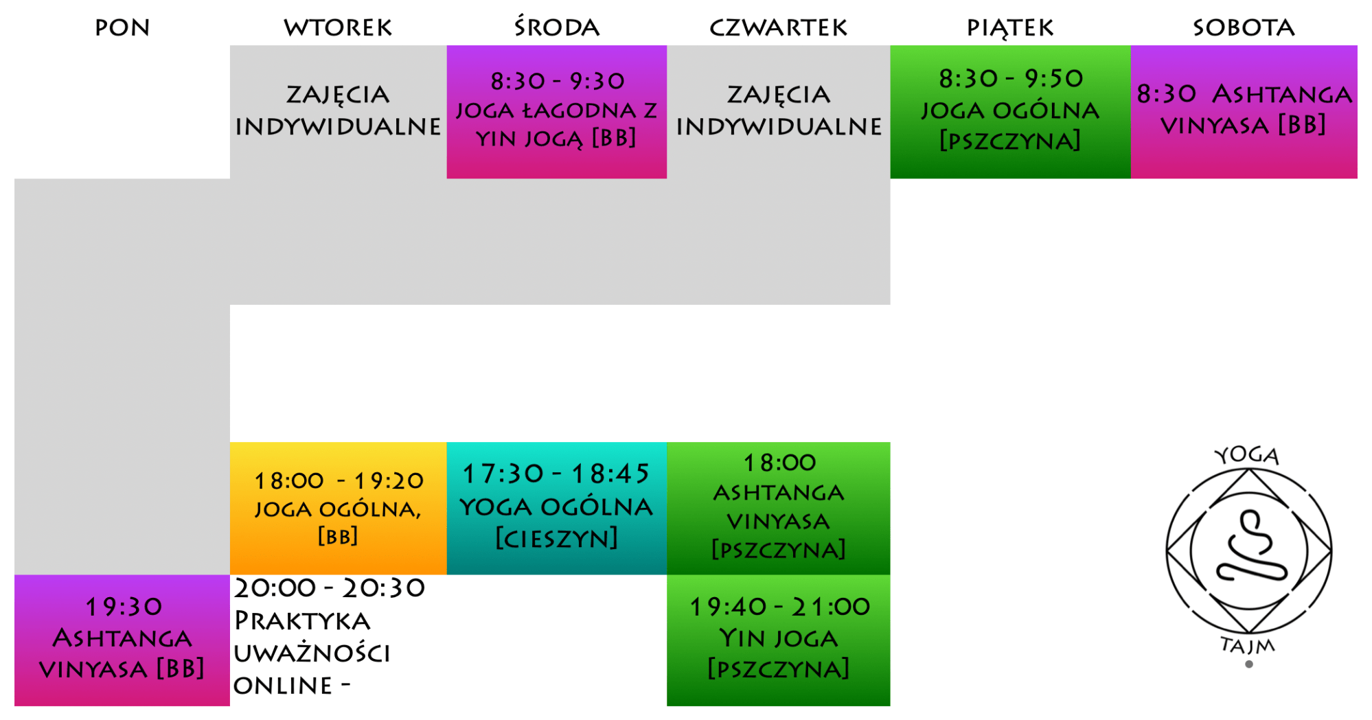 - Środa 17:30 – „Jogaland” – ul. Głęboka 47, Cieszyn